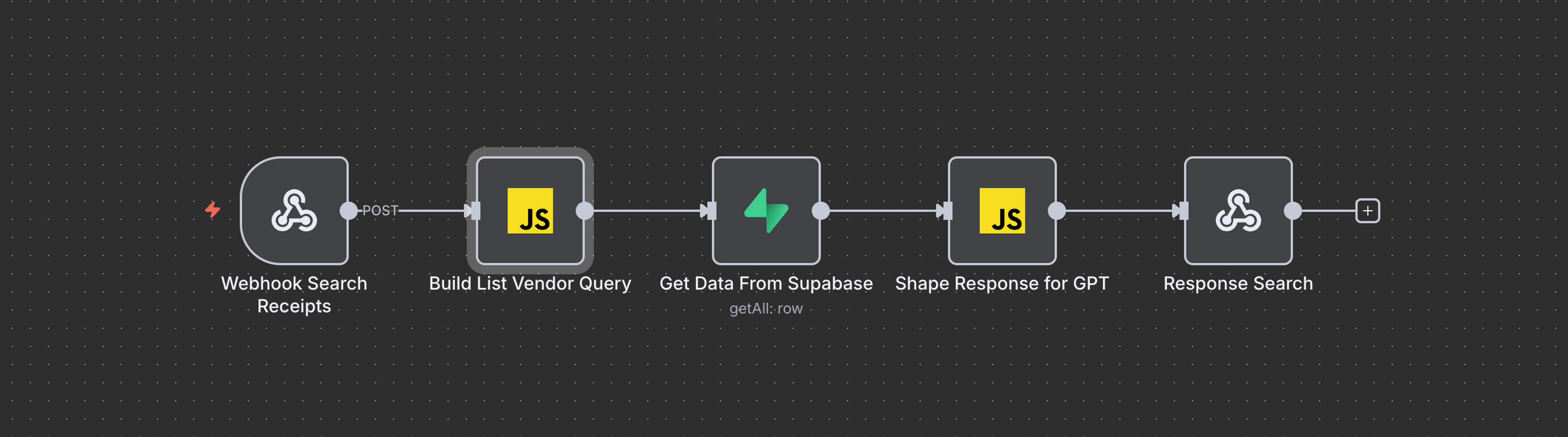 En webhook som tar inn leverandør og eventuelt dato-intervall, antall og sortering, for å så slå opp i Supabase og returnerer relevante kvitteringer med tjenestens navn, beløp, data, PDF-lenke og metadata. Denne brukes når AI-assistenten skal svare på for eksempel “Gi meg de tre siste Figma-kvitteringene”.