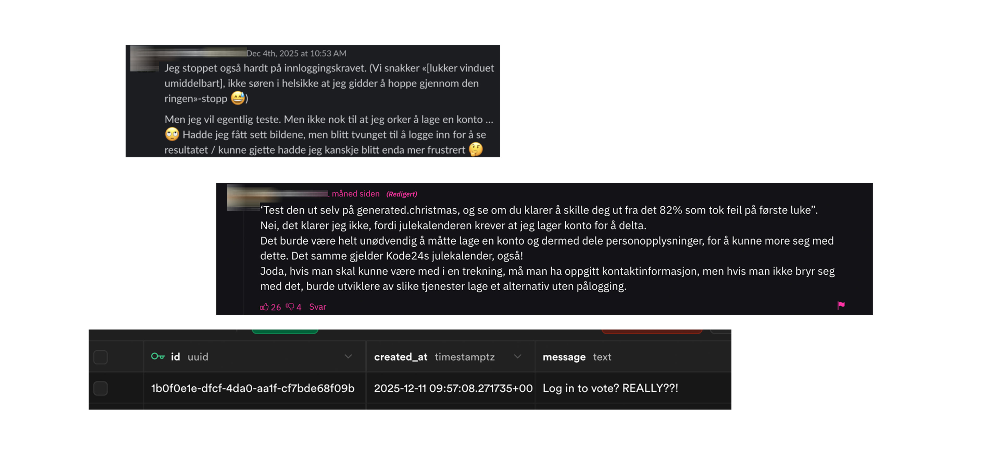 Men det er også læring å hente her. To ting står ut. Det første er at det var pålagt med logg inn for å kunne stemme. Det var ikke noe annen grunn til det enn at jeg ønsket dels at folk skulle kunne se sin statistikk, men også at det skulle bli vanskeligere å bare åpne et inkognitovindu, stemme og så prøve igjen på sin bruker. Men det også dette som ga solklart størst motbør. De første dagene kunne man heller ikke engang se bilde før man var tvungen å logge inn, som er rimelig dårlig UX.